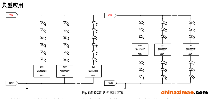 启特点,解决因电源电压衰减造成的LED灯带亮度不一致问题。SM15302T内置内部电源