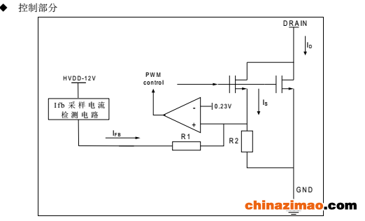 通过高压 MOS 的电流 ID 分成两个部分,其中一部分为 IS,这部分电流为芯片采样电流。IS 与 ID 成比例关系: