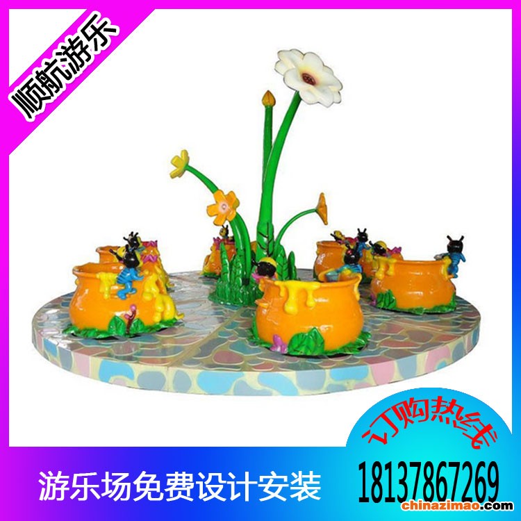 蜜蜂转转杯又叫蜜蜂转盘,是一种仿咖啡杯旋转类儿童游乐设备,座舱采用优质玻璃钢制作而成,每只花房造型的杯子上都有两只顽皮可爱的蜜蜂采蜜,整体造型梦幻卡通效果,是深受孩子们喜爱的儿童游乐设备,设备运行时底盘旋转的同时每只杯子也能360度旋转,加上彩灯闪烁,更加新鲜好玩。