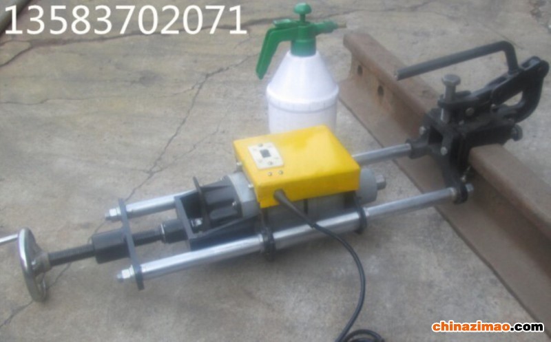 4、钢轨打开钻眼开孔机在各部件工作都无异常的情况下,进给丝杠,即可实施钻孔作业,钻孔时需为注水桶打压以确保冷却液不断注入到钻头上,延长钻头使用寿命。