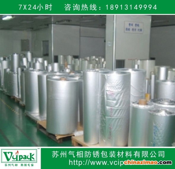 苏州气相防锈包装材料有限公司所产的VCI气相防锈铝箔袋/铝箔防锈袋/防锈铝箔复合袋/铝箔复合防锈袋/铝塑复合防锈袋/气相铝箔袋/VCI铝箔膜/VCI气相防锈防静电屏蔽防潮铝箔包装膜/袋是我司科研人员在VCI气相防锈塑料薄膜和防静电屏蔽防潮铝箔膜的基础上,综合高科技的气相防锈技术、塑料挤出吹塑技术、抗静电技术和防潮技术,采用特殊加工工艺复合生产而成。集真空干燥包装所需的空气水蒸气腐蚀性气体灰尘阳光阻隔性、防锈包装所需的气相防锈性、防静电包装所需的防静电屏蔽性及包装功能所需的物理强度四者于一体,具有优良的防蚀性、强度和抗静电屏蔽功能,它可以保护机械部件,特别是电子产品不受锈蚀、潮气和静电损坏,特别适用于集成电路板、印刷电路板、通讯设备、电子仪器和仪表及各种机床、大型军事装备、纺织设备、印刷包装设备、橡塑加工设备、压缩机、发动机等大型机电设备及部件等既需防锈又需防潮防静电屏蔽的产品和材料的工序间或仓储、海运的包装。也可以将本产品做成袋子,将电子产品装入袋中密封即可。内外表面电阻值达到10⁸~1010Ω。