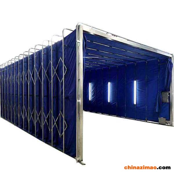 3、伸缩移动喷漆房整体为框架传动结构,每组框架间均有阻燃PVC布密封连接,安装快捷、外形美观,结构精巧,使用方便,制造成本低,节约;