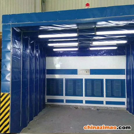 3、伸缩移动喷漆房整体为框架传动结构,每组框架间均有阻燃PVC布密封连接,安装快捷、外形美观,结构精巧,使用方便,制造成本低,节约;