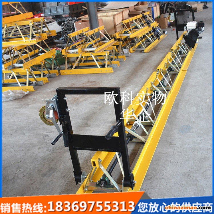 振动梁的操作简单方便易于作业,将振动梁按照所标序号组装,我们的振动梁是1米一节(也可做两米一节,可根据客户需要定做),将组装好的振动梁放在道路两边模具上,将两边的钢丝绳固定在同一水平位置,启动发动机,振动梁两边的工人同时摇动把手,通过缩短钢丝绳的长度使振动梁向前行走。