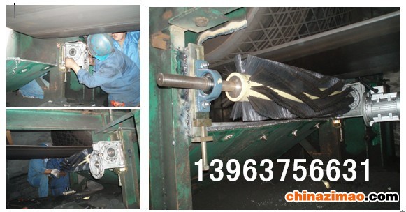 毛刷清扫器 煤矿皮带输送机毛刷清扫器 散装码头无动力毛刷清扫器清扫过程中不会造成胶带跑偏现象,安可靠、使用寿命长、维修费用低。清扫器工作时,清扫点连续接触,清扫有力,清扫效果好。尼龙刷采用杜邦公司生产产品、经过特殊工艺加工制作,不粘料、不结垢。对胶带无磨损 公司生产各类皮带清扫器,带式输送机输送的材料往往带有粘性物质,如煤尘、泥浆、粉状物料,其中一部分会粘在输送带工作面上,在卸料时不能卸掉,粘着物料便J入空载段的下托辊上,把托辊弄脏并粘有这些附着物。物料J入托辊壳体内,从而增大轴承座上的径向载荷和轴向载荷,使轴承快速磨损,甚至造成托辊停转,造成托辊磨损报废。托辊壳体粘上物料会撕裂和拉毛输送带的面胶,加速输送带磨损毁坏。如果粘着物J入机尾改向滚筒,就会粘在滚筒表面上,越粘越多,附着力也越来越大,结果是造成输送带跑偏,增加输送带磨损,酿成严重后果。输送带上残留的物料还会加大对滚筒的摩擦力,有时会引起输送带面胶和滚筒包胶层的撕裂。如果清扫装置良好,托辊、输送带等的使用寿命都可以延长。由此可见,清扫器在带式输送机上有着不可忽视的作用。在运行中,如果想人为清理机尾滚筒附着物,可能发生严重人身伤亡事故。因此,为保证带式输送机正常运转,   将输送带上的附着物清扫干净。在引J、消化和吸收   J技术的基础上,结合国内外各种清扫器的Y点,研制开发了新型电动毛刷式皮带清扫器,辊刷采用J口耐磨材料   而成,正常使用寿命一年以上,可更换,该产品以后的使用成本仅为更换滚刷的费用,   节约使用成本。毛刷式皮带清扫器具有清扫   ,不刮伤皮带,维护方便,使用寿命长等Y点,产品自投放市场以来,在电厂输煤皮带、化工、制糖、制药、港口码头等行业得到广泛应用,效果显著。可适用于国内各种类型及宽度的传送带。,延长胶带使用寿命。