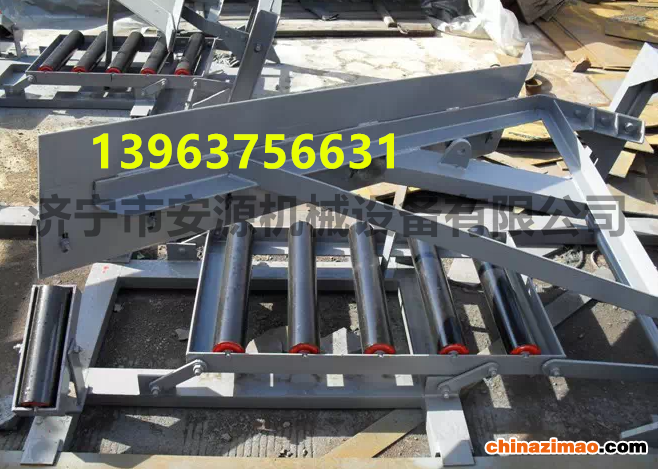 电液动犁式卸料器以电液动推杆为动力源,带动框架前进,完成犁头下落,并支承平托辊,犁刀下缘与胶带贴合,完成卸料。完华后,框架后退,犁头上抬,变形托辊恢复槽形,胶带则则恢复槽形,物料平稳通过。
