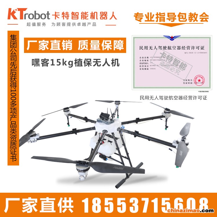 农用多旋翼无人机区别于市场上常见的农用直升机,简便式多旋翼机,该机采用模块化设计,使用与维护方便,稳定性无可比拟,防水、防摔、防故障效果好。该机采用锂电池作为飞行动力,平均每组电池可连续工作15分钟、两个架次、喷幅宽度和飞行高度可自由调整。使用多旋翼农用电子植保无人机进行作业,每架飞机每天可完成作业面积500亩以上,是人工效率的100倍以上。