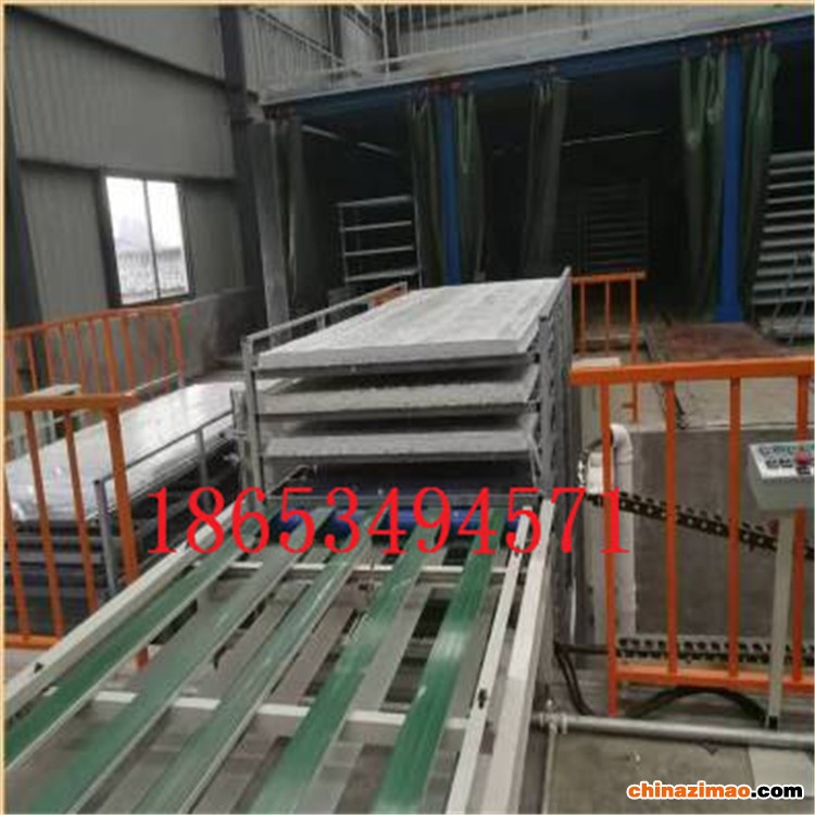 玻镁板设备厂在连续生产线连续同步完成发泡固化覆膜过程。面层轧压设备用于将面层材料轧压成设计所需要的花纹或图形;反应灌注机用于A料B料按工艺要求的比例计量混合;移动浇注机用于将混合的AB料及泡沫以往复移动的方式覆盖在下层面材上;层压机上下各一台,用于原料在上下层移动链板间固化定型;热风循环装置用于层压机内部的加温;贴侧边纸和侧边输送机用于板材测边挡料,修边机用于改性EPS防火保温板板两侧修边;自动跟踪机用于将板材切断成定长;生产方式为连续不间断,生产效率高产品质量稳定,板材密度均一。