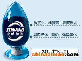 3高热辐射率涂层的应用:高含氮量纳米TiN粉作为高温中使用的高热辐射率涂层材料的关键材料,添加该组分所研制的涂层材料采用等离子喷涂技术制备的涂层,检测发现热辐射率性能大幅度提高,该产品主要应用于高温炉窑节能、军工等方面;