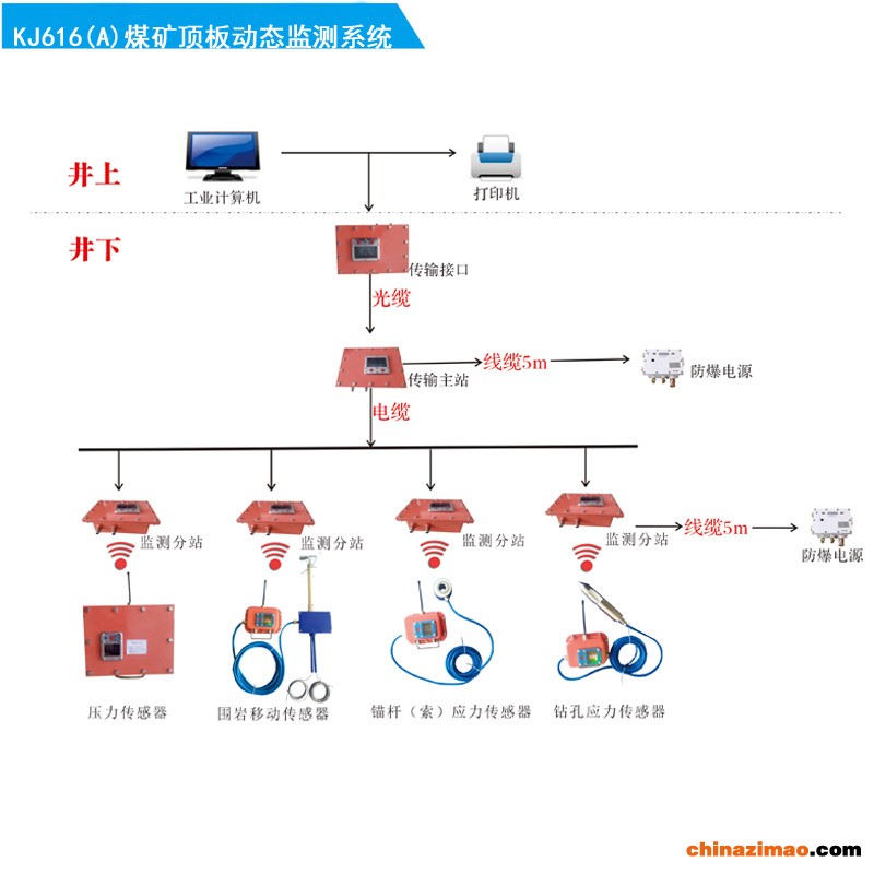 KJ616(A)煤矿顶板动态监测系统是用于煤矿综采支架工作阻力的计算机测量系统。系统将计算机检测技术、数据通讯技术和传感器技术融为一体,实时监测综采支架工作阻力等矿压参数,便于评价支架工作状态及支架与地质条件的适应性,研究采掘工作面矿压显现特征,为工作面顶板管理等工作提供依据。