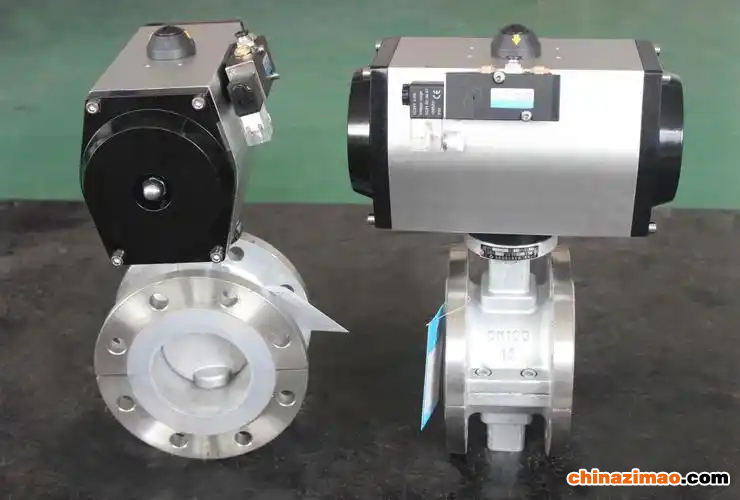 当气动执行器与电路和系统气源接通后,空气通过管道A或B管进入A缸(B缸)推动活塞向一端运动,从而带动旋转轴和球芯转动90°。