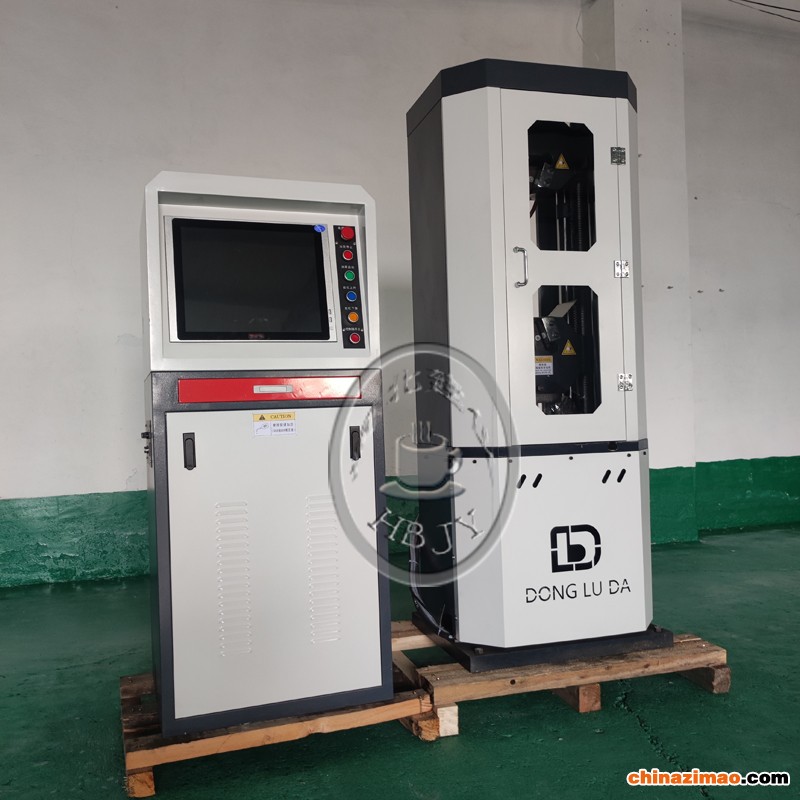 本设备主体部分由高度可调的支撑架[由机座、丝杆及移动横梁(下钳口座)组成]和工作框架[由工作油缸、活塞、台板、支架及上横梁(上钳口座)组成]。其工作原理为:由高压油泵向工作油缸供油,通过活塞运动,推动台板和上横梁(上钳口座)向上运动,进行试样的拉伸或压缩试验。拉伸试验在主机的上横梁与移动横梁之间进行,压缩试验在主机的台板与移动横梁之间进行。试验空间的调整通过驱动机构(升降电机、链轮、链条等)驱动双丝杆同步旋转使移动横梁升降达到。