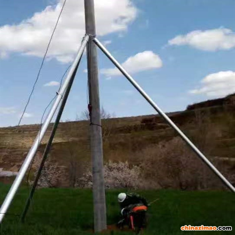 立杆机使用方法:      1、用立杆机主杆上配带的销钉,把主杆(长杆)、两副杆的头部进行连接。        2、把三杆成三角形状平放在地面上。提示:三杆头部连接处应位于杆坑处。        3、三名施工人员,各自握住一根杆体,用力上推把该机立起。 提示:在上推时为了不使杆体左右偏移,应保持三根杆的跟部不离开地面,三杆上推时推升距离应相等。例:主杆上推1米两副杆也应同步上推1米。        4、三角架立起后应确保三杆头部连接处与线杆坑底部垂直。        5、把将要立起的线杆运至适当位置。