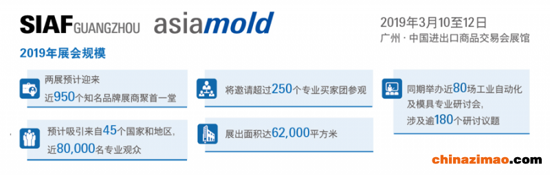 SIAF广州工业自动化展历经九年磨练,一直处于华南智能制造行业前沿,促进产业技术互融与革新,至今已发展为不可缺席的行业年度盛会。2019年SIAF展会将再度与广州国际模具展览会(Asiamold)同期举行,于3月10至12日于广州中国进出口商品交易会展馆迎来世界各地的业内人士,展示应用领域涵盖汽车工程、家电制造、电子工程、机械工程、包装印刷、消费品、照明、纺织品、医疗器械等,绘画智能制造的未来蓝图。