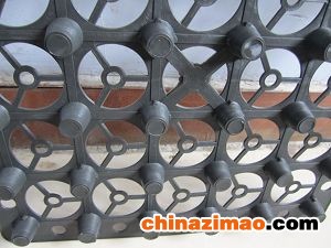圆锥突台(或中空圆柱形多孔)的塑胶底板,由高抗冲聚苯乙烯(HIPS)制成。圆锥突台(或中空圆柱多孔)的顶面胶接一滤层无纺布,以阻止泥土微粒通过,从而避免通道阻塞,使孔道排水顺畅。