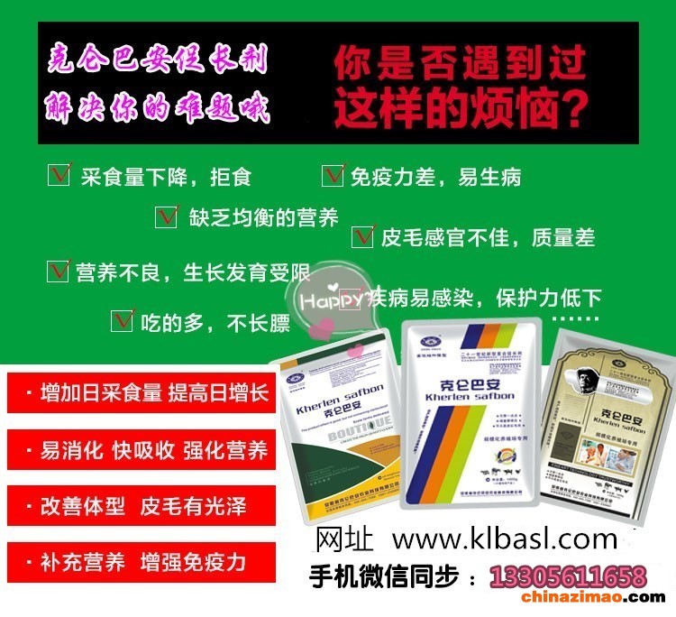 克仑巴安牌促长剂——绿色肉质体形改良促长剂,不含违禁药物,无药残,可加于预混料内、浓缩料内、全价料内。不含违禁成分,国家农业部批准生产的,国家高新技术企业,上海世博会参展企业,国家计量免检产品