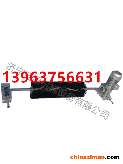 旋转式清扫器由电机、蜗轮式减速机、联轴器、刷辊、带调心轴承的轴承座等构成,刷辊是由进口耐磨尼龙丝沿轴身呈螺旋形布置而成,电机与减速机为本体构成驱动装置,通过联轴器与刷辊的一端相连。刷辊的另一端通过带调心轴承的轴承座支撑