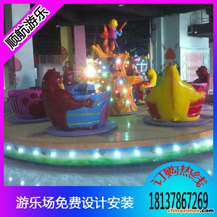 熊出没转杯是新开发的一款游乐设备,五彩缤纷的的熊大熊二抱着蜜罐杯在底盘上旋转的同时,蜜罐内也会向相反的方向旋转,会让游客产生一种失重、晕眩的感觉,同时蜜罐还在快速的移动,非常的具有趣味性、刺激性,经常使游客流连忘返,深受广大游客的厚爱。